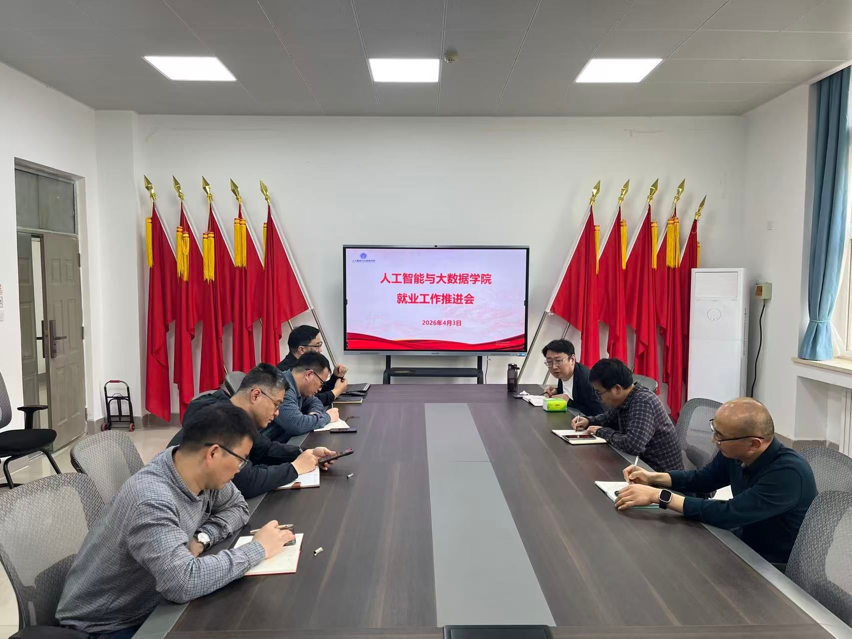 樊超围绕学科专业优势,对就业工作作出部署。他指出,要立足人工智能、大数据专业特色,深挖优质就业资源,加强校企合作与岗位推送;同时高度重视考研调剂工作,建立信息共享机制,一对一帮扶,为考生提供政策解读、院校对接、志愿指导等全流程服务,推动升学与就业双向发力。